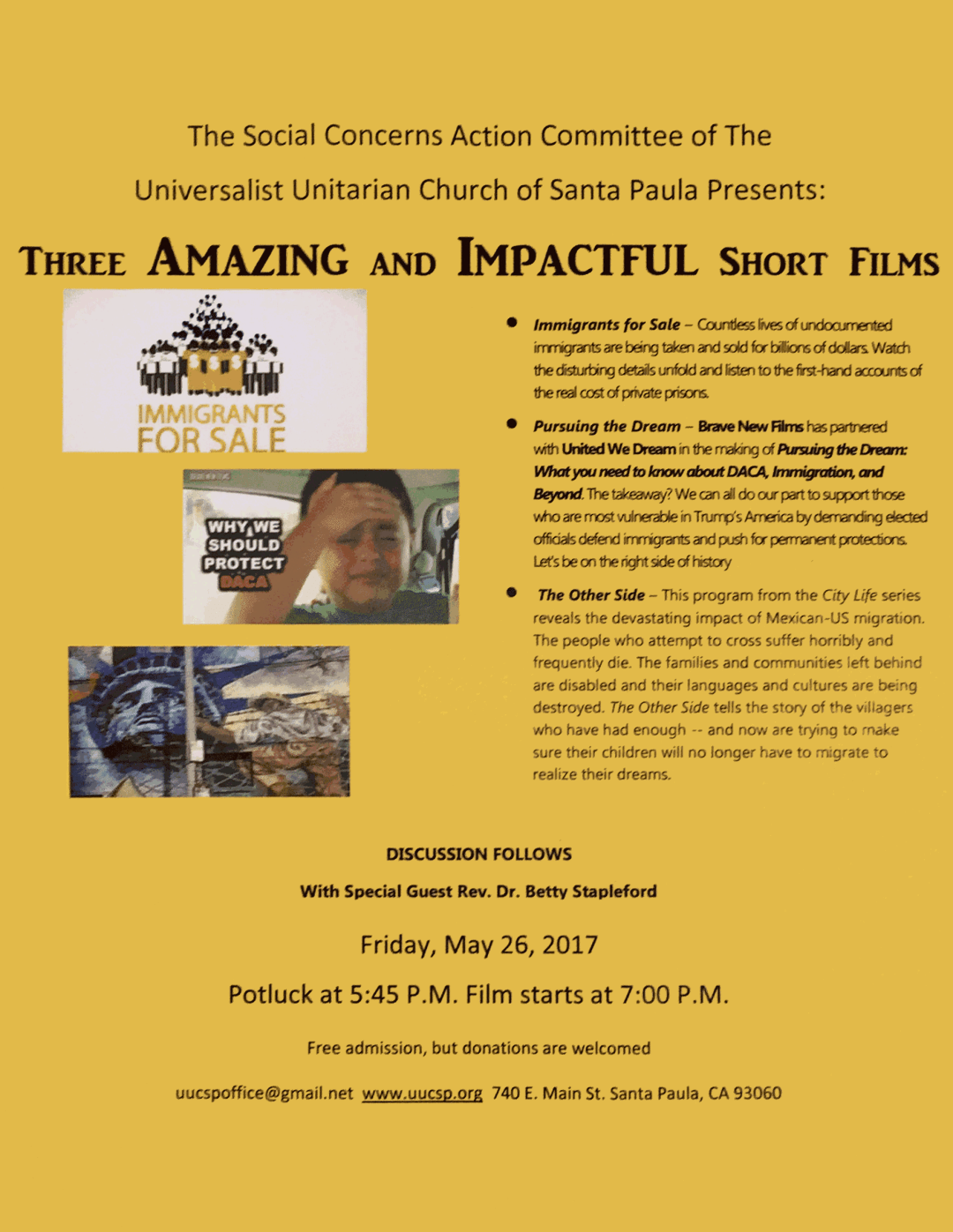 Join the Social Concerns Action Committee of the Universalist Unitarian Church of Santa Paula for a Film event on May 26th. Three Amazing and Impactful short films related to Immigration.